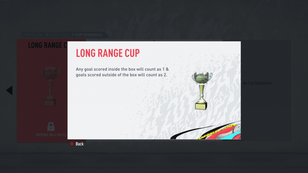 - Practice Match – Bei den Übungsspielen kann man alleine oder mit seinen Freunden in Pro Clubs gegen computergesteuerte Teams spielen. Hier ist die Stärke und das Verhalten des CPU-Gegners komplett einstellbar.