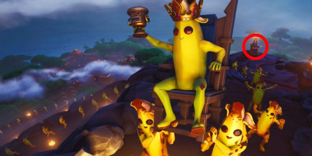 Was zeigt der Ladebildschirm? Diesmal seht ihr diverse Bananen-Skins, die scheinbar ihren Banenenkönig tragen. Das Ganze läuft auf dem Vulkan der neuen Map aus Season 8 ab.