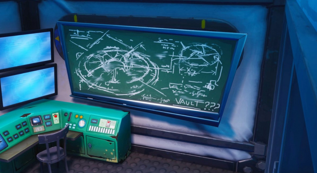 Passend dazu fanden einige Spieler auch eine Tafel, an der über ein Tresor geschrieben wird. Die Zeichnung an der Tafel erinnert dabei stark an das was gerade in Loot Lake freigelegt wird. Es könnte also ein Tresor sein, in dem die alten Items gelagert wurden