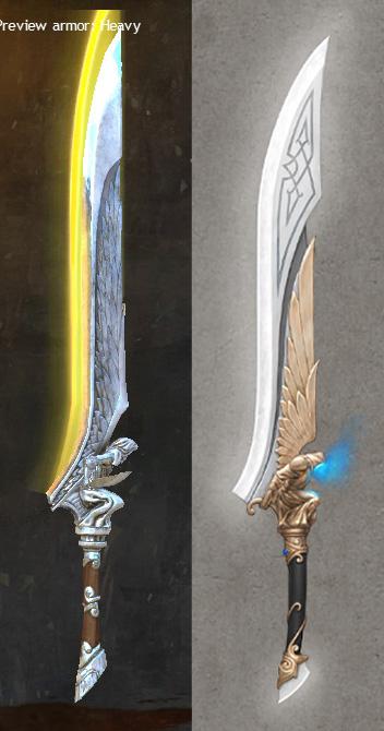Mit welcher Waffe gibt es starke Ähnlichkeiten? Im MMORPG Rift gibt es das Avenger’s Longsword, welches ebenfalls eine zweigeteilte Klinge, eine Figur am Knauf und sehr ähnliche Verzierungen besitzt.