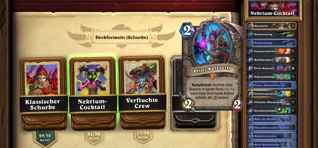 Alte Deckformeln sind nun unsinnig: Eines dieser Decks ist „Nekrium-Cocktail“ vom Schurken und basiert auf einer Menge Todesröcheln-Effekte. Unter anderem ist in diesem Deck auch die Karte „Prinz Keleseth“ enthalten. Dieser stärkt als Kampfschrei alle Diener im Deck mit +1/+1, aber nur dann, wenn das Deck keine weiteren Karten enthält, die 2 Mana kosten.