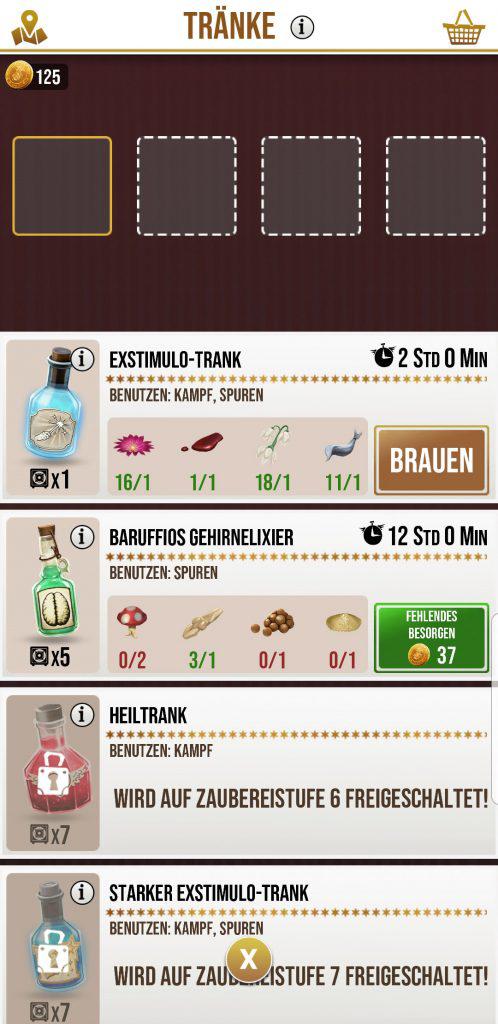 Tränke brauen: Wählt das Reisekoffer-Symbol unten in der Mitte eures Bildschirms. Dann tippt links auf Tränke. Nun wählt ihr eins der leeren Felder aus und anschließend navigiert ihr zu dem Trank, den ihr brauen wollt. Habt ihr die Zutaten zusammen, tippt ihr auf Brauen.