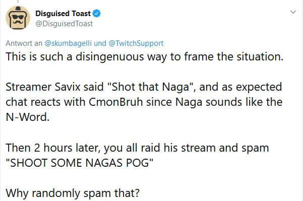 Laut Disguised Toast (und offenbar der Wahrnehmung der Verantwortlichen bei Twitch) sei es offensichtlich, dass „Nagas“ hier auf „Niggers“ anspielt – eine rassistische Beleidigung für Schwarze, die meistens nur als „N-Word“ abgekürzt wird. Sie hätten also quasi nur „Shoot some Niggers“ („Erschieß ein paar Nigger“) in Verkleidung gesagt.